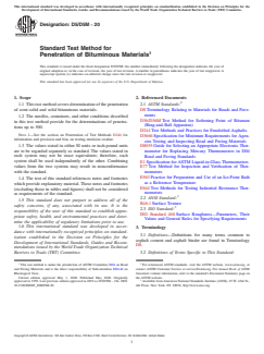 ASTM D5/D5M-20 is a standard published by ASTM International. Its full title is "Standard Test Method for Penetration of Bituminous Materials". This standard covers: SIGNIFICANCE AND USE 5.1 The penetration test is used as a measure of consistency. Higher values of penetration indicate softer consistency. Note 2: The quality of the results produced by this standard are dependent on the competence of the personnel performing the procedure and the capability, calibration, and maintenance of the equipment used. Agencies that meet the criteria of Specification D3666 are generally considered capable of competent and objective testing, sampling, inspection, etc. Users of this standard are cautioned that compliance with Specification D3666 alone does not completely ensure reliable results. Reliable results depend on many factors; following the suggestions of Specification D3666 or some similar acceptable guideline provides a means of evaluating and controlling some of those factors. SCOPE 1.1 This test method covers determination of the penetration of semi-solid and solid bituminous materials. 1.2 The needles, containers, and other conditions described in this test method provide for the determinations of penetrations up to 500. Note 1: See the section on Penetration of Test Methods D244 for information and precision and bias on testing emulsion residue. 1.3 The values stated in either SI units or inch-pound units are to be regarded separately as standard. The values stated in each system may not be exact equivalents; therefore, each system shall be used independently of the other. Combining values from the two systems may result in nonconformance with the standard. 1.4 The text of this standard references notes and footnotes which provide explanatory material. These notes and footnotes (excluding those in tables and figures) shall not be considered as requirements of the standard. 1.5 This standard does not purport to address all of the safety concerns, if any, associated with its use. It is the responsibility of the user of this standard to establish appropriate safety, health, and environmental practices and determine the applicability of regulatory limitations prior to use. 1.6 This international standard was developed in accordance with internationally recognized principles on standardization established in the Decision on Principles for the Development of International Standards, Guides and Recommendations issued by the World Trade Organization Technical Barriers to Trade (TBT) Committee.