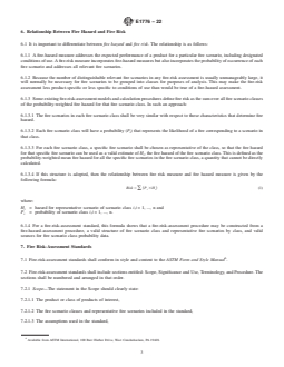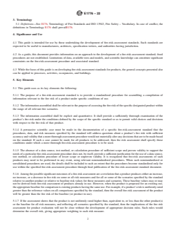 SIGNIFICANCE AND USE 4.1 This guide is intended for use by those undertaking the development of fire-risk-assessment standards. Such standards are expected to be useful to manufacturers, architects, specification writers, and authorities having jurisdiction. 4.2 As a guide, this document provides information on an approach to the development of a fire-risk-assessment standard; fixed procedures are not established. Limitations of data, available tests and models, and scientific knowledge can constitute significant constraints on the fire-risk-assessment procedure and associated standard. 4.3 While the focus of this guide is on developing fire-risk-assessment standards for products, the general concepts presented also can be applied to processes, activities, occupancies, and buildings. SCOPE 1.1 This guide covers the development of fire-risk-assessment standards. 1.2 This guide is directed toward development of standards that will provide procedures for assessing fire risks harmful to people, property, or the environment. 1.3 This standard does not purport to address all of the safety concerns, if any, associated with its use. It is the responsibility of the user of this standard to establish appropriate safety, health, and environmental practices and determine the applicability of regulatory limitations prior to use. 1.4 This standard is used to establish a means of combining the potential for harm in fire scenarios with the probabilities of occurrence of those scenarios. Assessment of fire risk using this standard depends upon many factors, including the manner in which the user selects scenarios and uses them to represent all scenarios relevant to the application. This standard cannot be used to assess fire risk if any specifications are different from those contained in the standard. 1.5 This fire standard cannot be used to provide quantitative measures. 1.6 This international standard was developed in accordance with internationally recognized principles on standardization established in the Decision on Principles for the Development of International Standards, Guides and Recommendations issued by the World Trade Organization Technical Barriers to Trade (TBT) Committee.
