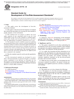 ASTM E1776-22 is a guide published by ASTM International. Its full title is "Standard Guide for Development of Fire-Risk-Assessment Standards". This standard covers: SIGNIFICANCE AND USE 4.1 This guide is intended for use by those undertaking the development of fire-risk-assessment standards. Such standards are expected to be useful to manufacturers, architects, specification writers, and authorities having jurisdiction. 4.2 As a guide, this document provides information on an approach to the development of a fire-risk-assessment standard; fixed procedures are not established. Limitations of data, available tests and models, and scientific knowledge can constitute significant constraints on the fire-risk-assessment procedure and associated standard. 4.3 While the focus of this guide is on developing fire-risk-assessment standards for products, the general concepts presented also can be applied to processes, activities, occupancies, and buildings. SCOPE 1.1 This guide covers the development of fire-risk-assessment standards. 1.2 This guide is directed toward development of standards that will provide procedures for assessing fire risks harmful to people, property, or the environment. 1.3 This standard does not purport to address all of the safety concerns, if any, associated with its use. It is the responsibility of the user of this standard to establish appropriate safety, health, and environmental practices and determine the applicability of regulatory limitations prior to use. 1.4 This standard is used to establish a means of combining the potential for harm in fire scenarios with the probabilities of occurrence of those scenarios. Assessment of fire risk using this standard depends upon many factors, including the manner in which the user selects scenarios and uses them to represent all scenarios relevant to the application. This standard cannot be used to assess fire risk if any specifications are different from those contained in the standard. 1.5 This fire standard cannot be used to provide quantitative measures. 1.6 This international standard was developed in accordance with internationally recognized principles on standardization established in the Decision on Principles for the Development of International Standards, Guides and Recommendations issued by the World Trade Organization Technical Barriers to Trade (TBT) Committee.