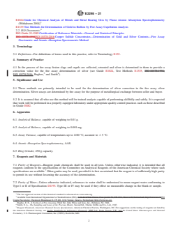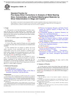 ASTM E2295-21 is a standard published by ASTM International. Its full title is "Standard Practice for Fire Assay Silver Corrections in Analysis of Metal Bearing Ores, Concentrates, and Related Metallurgical Materials by Silver Determination in Slags and Cupels". This standard covers: SIGNIFICANCE AND USE 5.1 These methods are primarily intended to be used for the determination of silver correction in the fire assay silver determination. Silver assays are determined by fire assay for the purpose of metallurgical exchange between seller and buyer. 5.2 It is assumed that all who use this method will be trained analysts capable of performing skillfully and safely. It is expected that work will be performed in a properly equipped laboratory under appropriate quality control practices such as those described in Guide E882. SCOPE 1.1 This practice covers the determination of silver corrections for fire assay of metal bearing ores, concentrates, and related metallurgical materials using the spent slags and cupels from the fire assay process, by gravimetry and atomic absorption spectrophotometry. 1.2 The test methods appear in the following order: Sections Gravimetric Method 10–11 Atomic Absorption Method 12–13 1.3 Units—The values stated in SI units are to be regarded as standard. No other units of measurement are included in this standard. 1.4 This standard does not purport to address all of the safety concerns, if any, associated with its use. It is the responsibility of the user of this standard to establish appropriate safety, health, and environmental practices and determine the applicability of regulatory limitations prior to use. (See Practices E50 and ISO Guide 35:1989.) 1.5 This international standard was developed in accordance with internationally recognized principles on standardization established in the Decision on Principles for the Development of International Standards, Guides and Recommendations issued by the World Trade Organization Technical Barriers to Trade (TBT) Committee.