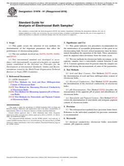 ASTM D1978-91(2018) is a guide published by ASTM International. Its full title is "Standard Guide for Analysis of Electrocoat Bath Samples". This standard covers: SIGNIFICANCE AND USE 3.1 This guide indicates test procedures recommended for the maintenance of acceptable performance of the paint in an electrocoating bath. Several critical parameters must be determined throughout the operation of the bath. These parameters must be adjusted when deviations from the norm occur. 3.2 The test methods for electrocoat baths are unique, as the aqueous samples have a nonvolatile content between 8 and 25 %. Constant agitation must be present when the samples are taken and during the measurement of some of the parameters. SCOPE 1.1 This guide covers the selection of test methods for determination of the important parameters that affect the performance of electrocoating paints. 1.2 The test methods involved are D4370, D4399, D4584, and D5145. 1.3 This international standard was developed in accordance with internationally recognized principles on standardization established in the Decision on Principles for the Development of International Standards, Guides and Recommendations issued by the World Trade Organization Technical Barriers to Trade (TBT) Committee.