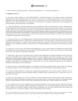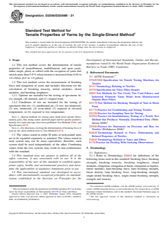 SIGNIFICANCE AND USE 5.1 Acceptance Testing—Option A1 of Test Method D2256 is considered satisfactory for acceptance testing of commercial shipments because the test method has been used extensively in the trade for acceptance testing. However, this statement is not applicable to knot and loop breaking force tests, tests on wet specimens, tests on oven-dried specimens, or tests on specimens exposed to low or high temperatures and should be used with caution for acceptance testing because factual information on between-laboratory precision and bias is not available. 5.1.1 If there are differences of practical significance between reported test results for two laboratories (or more), comparative tests should be performed to determine if there is a statistical bias between them, using competent statistical assistance. As a minimum, use the samples for such a comparative tests that are as homogeneous as possible, drawn from the same lot of material as the samples that resulted in disparate results during initial testing and randomly assigned in equal numbers to each laboratory. The test results from the laboratories involved should be compared using a statistical test for unpaired data, a probability level chosen prior to the testing series. If a bias is found, either its cause must be found and corrected, or future test results for that material must be adjusted in consideration of the known bias. 5.2 Fundamental Properties—The breaking tenacity, calculated from the breaking force and the linear density, and the elongation are fundamental properties that are widely used to establish limitations on yarn processing or conversion and on their end-use applications. Initial modulus is a measure of the resistance of the yarn to extension at forces below the yield point. The chord modulus is used to estimate the resistance to imposed strain. The breaking toughness is a measure of the work necessary to break the yarn. 5.3 Comparison to Skein Testing—The single-strand method gives a more a... SCOPE 1.1 This test method covers the determination of tensile properties of monofilament, multifilament, and spun yarns, either single, plied, or cabled with the exception of yarns that stretch more than 5.0 % when tension is increased from 0.05 to 1.0 cN/tex [0.5 to 1.0 gf/tex]. 1.2 This test method covers the measurement of breaking force and elongation of yarns and includes directions for the calculation of breaking tenacity, initial modulus, chord modulus, and breaking toughness. 1.2.1 Options are included for the testing of specimens in: (A) straight, (B) knotted, and (C) looped form. 1.2.2 Conditions of test are included for the testing of specimens that are: (1) conditioned air, (2) wet, not immersed, (3) wet, immersed, (4) oven-dried, (5) exposed to elevated temperature, or (6) exposed to low temperature. Note 1: Special methods for testing yarns made from specific fibers; namely, glass, flax, hemp, ramie, and kraft paper and for specific products; namely, tire cords and rope, have been published: Test Methods D885, and Specification D578. Note 2: For directions covering the determination of breaking force of yarn by the skein method refer to Test Method D1578. 1.3 The values stated in either SI units or inch-pound units are to be regarded separately as standard. The values stated in each system may not be exact equivalents; therefore, each system shall be used independently of the other. Combining values from the two systems may result in non-conformance with the standard. 1.4 This standard does not purport to address all of the safety concerns, if any, associated with its use. It is the responsibility of the user of this standard to establish appropriate safety, health, and environmental practices and determine the applicability of regulatory limitations prior to use. 1.5 This international standard was developed in accordance with internationally recognized principles on standardization estab...