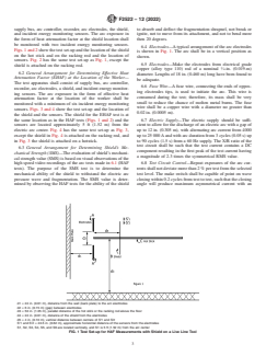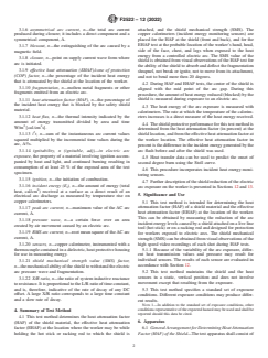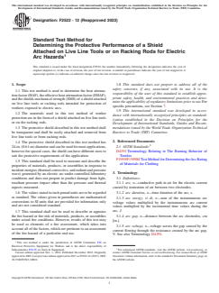 ASTM F2522-12(2022) is a standard published by ASTM International. Its full title is "Standard Test Method for Determining the Protective Performance of a Shield Attached on Live Line Tools or on Racking Rods for Electric Arc Hazards". This standard covers: SIGNIFICANCE AND USE 5.1 This test method is intended for determining the heat attenuation factor (HAF) of a shield material and the effective heat attenuation factor (EHAF) at the location of the worker. This can be obtained by measuring the reduction of the arc incident energy levels caused by a shield attached on a live line tool (hot stick) or on a racking rod and designed for protection for workers exposed to electric arcs. The shield mechanical strength (SMS) can be obtained from visual observations of the high speed video recordings of each shot during HAF tests. 5.1.1 Because of the variability of the arc exposure, different heat transmission values and pressure may result for individual sensors. The results of each sensor are evaluated in accordance with Section 12. 5.2 This test method maintains the shield and the heat sensors in a static, vertical position and does not involve movement except that resulting from the exposure. 5.3 This test method specifies a standard set of exposure conditions. Different exposure conditions may produce different results. Note 1: In addition to the standard set of exposure conditions, other conditions representative of the expected hazard may be used and shall be reported should this data be cited. SCOPE 1.1 This test method is used to determine the heat attenuation factor (HAF), the effective heat attenuation factor (EHAF), and the shields mechanical strength (SMS) of a shield attached on live line tools or racking rods intended for protection of workers exposed to electric arcs. 1.2 The materials used in this test method of worker protection are in the form of a shield attached on live line tools or on the racking rods. 1.3 The protective shield described in this test method shall be transparent and shall be easily attached and removed from live line tools or from racking rods. 1.4 The protective shield described in this test method has 24-in. (0.61-m) diameter and can be used for most applications, however for special cases, the shield can have different sizes to suit the protective requirements of the application. 1.5 This standard shall be used to measure and describe the properties of materials, products, or assemblies in response to incident energies (thermal-convective, and radiant and pressure wave) generated by an electric arc under controlled laboratory conditions and does not purport to predict damage from light, resultant pressure impact other than the pressure and thermal aspects measured. 1.6 The values stated in inch-pound units are to be regarded as standard. The values given in parentheses are mathematical conversions to SI units that are provided for information only and are not considered standard. 1.7 This standard shall not be used to describe or appraise the fire hazard or fire risk of materials, products, or assemblies under actual fire conditions. However, results of this test may be used as elements of a fire assessment, which takes into account all of the factors, which are pertinent to an assessment of the fire hazard of a particular end use. 1.8 This standard does not purport to address all of the safety concerns, if any, associated with its use. It is the responsibility of the user of this standard to establish appropriate safety, health, and environmental practices and determine the applicability of regulatory limitations prior to use.For specific precautions, see Section 7. 1.9 This international standard was developed in accordance with internationally recognized principles on standardization established in the Decision on Principles for the Development of International Standards, Guides and Recommendations issued by the World Trade Organization Technical Barriers to Trade (TBT) Committee.