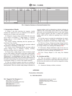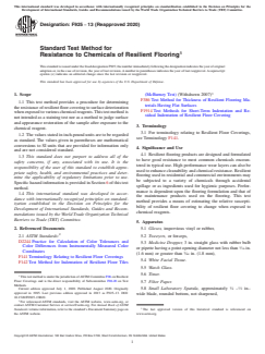 SIGNIFICANCE AND USE 4.1 Resilient flooring products are designed and formulated to have good resistance to most common chemicals encountered in typical use. High performance wear layers can also be used to enhance cleanability and chemical resistance. Resilient flooring used in residential and commercial environments may be subjected to a variety of chemicals through accidental spillage or as ingredients used for hygienic purposes. Performance is dependent upon the flooring formulation and that of the maintenance products used on the flooring. This test method provides a means of estimating the relative susceptibility of resilient floor covering to change when exposed to chemical reagents. SCOPE 1.1 This test method provides a procedure for determining the resistance of resilient floor covering to surface deterioration when exposed to various chemical reagents. This test method is not intended as a staining test nor as a method to judge surface and appearance restoration of the sample after exposure to the chemical reagent. 1.2 The values stated in inch-pound units are to be regarded as standard. The values given in parentheses are mathematical conversions to SI units that are provided for information only and are not considered standard. 1.3 This standard does not purport to address all of the safety concerns, if any, associated with its use. It is the responsibility of the user of this standard to establish appropriate safety, health, and environmental practices and determine the applicability of regulatory limitations prior to use. Specific hazard information is provided in Section 6 of this test method. 1.4 This international standard was developed in accordance with internationally recognized principles on standardization established in the Decision on Principles for the Development of International Standards, Guides and Recommendations issued by the World Trade Organization Technical Barriers to Trade (TBT) Committee.