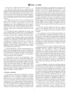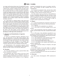 SIGNIFICANCE AND USE 5.1 Eddy current testing is a nondestructive method that can be used to locate discontinuities in tubing made of materials that conduct electricity. Signals can be produced by discontinuities located either on the inner or outer surfaces of the tube, or by discontinuities totally contained within the tube wall. When using an internal probe, the density of eddy currents in the tube wall decreases very rapidly as the distance from the internal surface increases; thus the amplitude of the response to outer surface discontinuities decreases correspondingly. 5.2 Some indications obtained by this method may not be relevant to product quality. For example, an irrelevant signal may be caused by metallurgical or mechanical variations that are generated during manufacture but that are not detrimental to the end use of the product. Irrelevant indications can mask unacceptable discontinuities occurring in the same area. Relevant indications are those that result from nonacceptable discontinuities. Any indication above the reject level, which is believed to be irrelevant, shall be regarded as unacceptable until it is proven to be irrelevant. For tubing installed in heat exchangers, predictable sources of irrelevant indications are lands (short unfinned sections in finned tubing), dents, scratches, tool chatter marks, or variations in cold work. Rolling tubes into the supports may also cause irrelevant indications, as may the tube supports themselves. Eddy current examination systems are generally not able to separate the indication generated by the end of the tube from indications of discontinuities adjacent to the ends of the tube (end effect). Therefore, this examination may not be valid at the boundaries of the tube sheets. SCOPE 1.1 This practice describes procedures to be followed during eddy current examination (using an internal, probe-type, coil assembly) of nonmagnetic tubing that has been installed in a heat exchanger. The procedure recognizes both the unique problems of implementing an eddy current examination of installed tubing, and the indigenous forms of tube-wall deterioration which may occur during this type of service. The document primarily addresses scheduled maintenance inspection of heat exchangers, but can also be used by manufacturers of heat exchangers, either to examine the condition of the tubes after installation, or to establish baseline data for evaluating subsequent performance of the product after exposure to various environmental conditions. The ultimate purpose is the detection and evaluation of particular types of tube integrity degradation which could result in in-service tube failures. 1.2 This practice does not establish acceptance criteria; they must be specified by the using parties. 1.3 This standard does not purport to address all of the safety concerns, if any, associated with its use. It is the responsibility of the user of this standard to establish appropriate safety, health, and environmental practices and determine the applicability of regulatory limitations prior to use. 1.4 This international standard was developed in accordance with internationally recognized principles on standardization established in the Decision on Principles for the Development of International Standards, Guides and Recommendations issued by the World Trade Organization Technical Barriers to Trade (TBT) Committee.