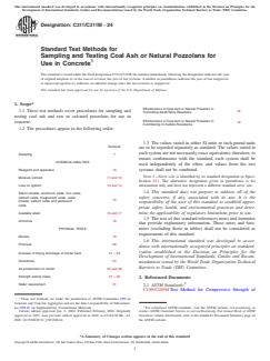 ASTM C311/C311M-24, published by ASTM International, details standard test methods for sampling and testing coal ash and natural pozzolans (both raw and calcined) intended for use in concrete. This standard ensures consistency and quality control for supplementary cementitious materials by providing clear laboratory testing procedures. The methods specified in ASTM C311/C311M-24 develop data for evaluating materials against ASTM C618 and ASTM C1697 requirements, helping determine suitability for concrete applications with respect to chemical and physical properties. Importantly, these methods are designed for laboratory environments and do not replicate site or job conditions.