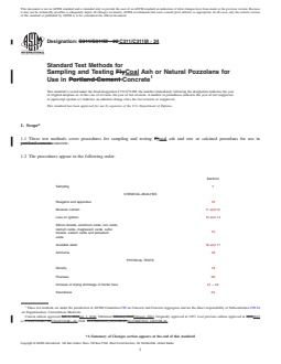 1.1 These test methods cover procedures for sampling and testing coal ash and raw or calcined pozzolans for use in concrete.