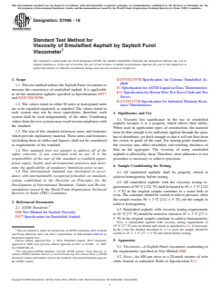SIGNIFICANCE AND USE 3.1 Viscosity has significance in the use of emulsified asphalts because it is a property which affects their utility. When used in application types of construction, the material must be thin enough to be uniformly applied through the spray bar of distributor, yet thick enough so that it will not flow from the crown or grade of the road. For mixing-grade emulsions, the viscosity may affect mixability and resulting thickness of film on the aggregate. The viscosity of many emulsified asphalts is affected by shear. Therefore, strict adherence to test procedure is necessary to achieve precision. SCOPE 1.1 This test method utilizes the Saybolt Furol viscometer to measure the consistency of emulsified asphalt. It is applicable to all the emulsified asphalts specified in Specifications D977 and D2397/D2397M. 1.2 The values stated in either SI units or inch-pound units are to be regarded separately as standard. The values stated in each system may not be exact equivalents; therefore, each system shall be used independently of the other. Combining values from the two systems may result in noncompliance with the standard. 1.3 The text of this standard references notes and footnotes which provide explanatory material. These notes and footnotes (excluding those in tables and figures) shall not be considered as requirements of the standard. 1.4 This standard does not purport to address all of the safety concerns, if any, associated with its use. It is the responsibility of the user of this standard to establish appropriate safety, health, and environmental practices and determine the applicability of regulatory limitations prior to use. 1.5 This international standard was developed in accordance with internationally recognized principles on standardization established in the Decision on Principles for the Development of International Standards, Guides and Recommendations issued by the World Trade Organization Technical Barriers to Trade (TBT) Committee.