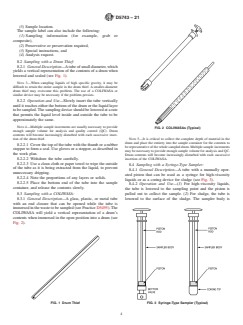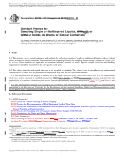 SIGNIFICANCE AND USE 5.1 This practice is intended for use in collecting samples of single and multilayered liquids, with or without solids, from drums or similar containers, including those that are unstable, ruptured, or otherwise compromised. Special handling procedures (for example, remote drum opening, over-pressurized drum opening, drum deheading, etc.) are described in Drum Handling Practices at Hazardous Waste Sites. SCOPE 1.1 This practice covers typical equipment and methods for collecting samples of single or multilayered liquids, with or without solids, in drums or similar containers. These methods are adapted specifically for sampling drums having a volume of 110 gal (416 L) or less. These methods are applicable to hazardous material, product, or waste. Specific sample collection and handling requirements should be described in the site-specific work plan. 1.2 The values stated in inch-pound units are to be regarded as standard. The values given in parentheses are mathematical conversions to SI units that are provided for information only and are not considered standard. 1.3 This standard does not purport to address all of the safety concerns, if any, associated with its use. It is the responsibility of the user of this standard to establish appropriate safety, health, and environmental practices and determine the applicability of regulatory limitations prior to use. Specific precautionary statements are given in 7.2.4, 7.2.7.1, and Notes 1 and 2. 1.4 This international standard was developed in accordance with internationally recognized principles on standardization established in the Decision on Principles for the Development of International Standards, Guides and Recommendations issued by the World Trade Organization Technical Barriers to Trade (TBT) Committee.
