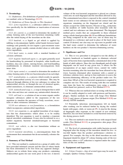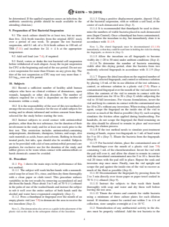 SIGNIFICANCE AND USE 5.1 This in vivo procedure is designed to test the ability of hygienic handwash or handrub agents to eliminate selected types of bacteria from experimentally contaminated skin of the hands of adult subjects. Since the two thumbpads and all eight fingerpads can be used in any given test, it allows for the incorporation of an input control (two), control for viable bacteria remaining after the inoculum has been allowed to dry (two), bacteria eliminated after treatment with a control or reference solution (two), and up to four replicates to assess the bacteria-eliminating efficiency of the product under test. No more than 100 µL of the test bacterial suspension is required to complete one test. The results of testing with this test method may form the basis for confirmatory tests using a suitable whole-hand test protocol, such as Test Method E1174. 5.2 Whereas this test method relates to testing with bacteria, it can be readily adapted to work with protozoa and bacteriophages. Similar methods for work with fungi (Test Method E2613) and viruses of human origin (Test Method E1838) are already ASTM standards. 5.3 Potentially infectious microorganisms left on hands after washing can be reduced further by drying the washed hands with paper, cloth, or warm air (7). A step for the drying of fingerpads after exposure to the control or test solution, therefore, has not been included to avoid bacterial removal by the drying process itself. 5.4 This test method is not meant for use with surgical hand scrubs (Test Method E1115) or preoperative skin preps (Test Method E1173). 5.5 The level of contamination with viable bacteria on each fingerpad after the drying of the inoculum should be five- to ten-fold higher than the product performance criterion required. For example, the titer in the dried inoculum on each fingerpad should be about 105 colony forming units of the test bacterium when a >104 reduction is required under the conditions of this test method. SCOPE 1.1 This test method is designed to determine the activity of hygienic handwash and handrub (4) agents against transient bacterial flora on hands and is not meant for use with surgical hand scrubs or preoperative skin preps. 1.2 Performance of this procedure requires the knowledge of regulations pertaining to the protection of human subjects.3 1.3 The test method should be performed by persons with training in microbiology in facilities designed and equipped for work with infectious agents at biosafety level 2 (5). 1.4 The values stated in SI units are to be regarded as standard. No other units of measurement are included in this standard. 1.5 This standard does not purport to address all of the safety concerns, if any, associated with its use. It is the responsibility of the user of this standard to establish appropriate safety, health, and environmental practices and determine the applicability of regulatory limitations prior to use. 1.6 This international standard was developed in accordance with internationally recognized principles on standardization established in the Decision on Principles for the Development of International Standards, Guides and Recommendations issued by the World Trade Organization Technical Barriers to Trade (TBT) Committee.