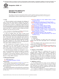 ASTM D2259-21 is a standard published by ASTM International. Its full title is "Standard Test Method for Shrinkage of Yarns". This standard covers: SIGNIFICANCE AND USE 5.1 Test Method D2259 for testing yarn for shrinkage in boiling water, saturated steam, dry heat, or solvents is considered satisfactory for acceptance testing of commercial shipments of yarn because the test method has been used extensively in the trade for that purpose. 5.1.1 If there are differences of practical significance between reported test results for two laboratories (or more), comparative tests should be performed to determine if there is a statistical bias between them, using competent statistical assistance. As a minimum, use the samples for such comparative tests that are as homogeneous as possible, drawn from the same lot of material as the samples that resulted in disparate results during initial testing and randomly assigned in equal numbers to each laboratory. The test results from the laboratories involved should be compared using a statistical test for unpaired data, a probability level chosen prior to the testing series. If a bias is found, either its cause must be found and corrected, or future test results for that material must be adjusted in consideration of the known bias. 5.2 Results obtained by this test method can be used for the following purposes: 5.2.1 As an aid in predicting the dimensional stability of fabrics to wet processing, 5.2.2 As an aid in predicting the dimensional stability of fabrics during processing at elevated temperatures, and 5.2.3 As a control measure in the manufacture of some types of fibers. 5.3 The shrinkage medium to be used in the test depends on the requirements of the parties involved. 5.4 The procedure for shrinkage in boiling water is described in Section 12, for shrinkage in dry heat in Section 13, for shrinkage in saturated steam in Section 14, and for shrinkage in solvents in Section 15. A 30-min exposure time is prescribed for boiling water. In exposure to dry heat, saturated steam, or solvents, the extent of change in the length of yarn is dependent upon the fiber type and upon t... SCOPE 1.1 This test method is used to determine the shrinkage of yarns in skein form when treated in boiling water, dry heat, saturated steam, or solvents. This test method is applicable to yarns made from any fiber or combination of fibers where the tex of the yarn is known or can be determined. This test method is not recommended for elastomeric yarns and those yarns that stretch more than 5 % under the tension loadings prescribed, although it has been used for the latter. Note 1: Procedures for determining yarn shrinkage and bulk properties of textured yarns are covered in Test Method D4031. 1.2 This test method shows the values in both SI and inch-pound units. “SI” units is the technically correct name for the system of metric units known as the International System of Units. “Inch-pound” units is the technically correct name for the customary units used in the United States. The values stated in either SI units or in other units shall be regarded as standard. The values expressed in each system may not be exact equivalents; therefore each system must be used independently of the other without combining in any way. 1.3 This standard does not purport to address all of the safety concerns, if any, associated with its use. It is the responsibility of the user of this standard to establish appropriate safety, health, and environmental practices and determine the applicability of regulatory limitations prior to use. 1.4 This international standard was developed in accordance with internationally recognized principles on standardization established in the Decision on Principles for the Development of International Standards, Guides and Recommendations issued by the World Trade Organization Technical Barriers to Trade (TBT) Committee.