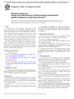 ASTM F2538-07a(2019), Standard Practice for Design and Manufacture of Reciprocating Compression Ignition Engines for Light Sport Aircraft, provides essential guidance for the design and production of engines used in light sport aircraft operating under Visual Flight Rules (VFR). Developed by ASTM International, this practice defines the minimum requirements and criteria designers and manufacturers must follow to ensure engine safety, reliability, and regulatory compliance. The standard emphasizes the importance of robust documentation, thorough testing, and alignment with internationally recognized principles on standardization.