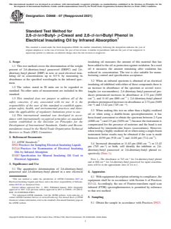 ASTM D2668-07(2021) - Standard Test Method for 2,6-<emph type="bold"><emph type="ital">di-tert</emph></emph >-Butyl-<emph type="bold"><emph type="ital"> p</emph></emph>-Cresol and 2,6-<emph type="bold"><emph type="ital">di-tert</emph></emph>-Butyl Phenol in Electrical Insulating Oil by Infrared Absorption