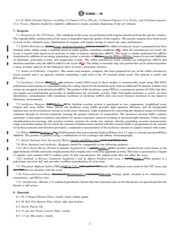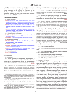 SIGNIFICANCE AND USE 5.1 The CFT assay provides a sensitive and reliable method to detect ricin biological activity and results can be generated within 3 h. The assay measures the amount of ricin biological activity when compared to a known ricin standard and provides a quantitative measurement for active ricin. 5.2 The lower limit of quantitation and the upper limit of quantitation for ricin using the CFT assay were measured at 10 ng/mL and 170 ng/mL, respectively (5). 5.3 This practice is focused on the measurement of reference materials and not environmental samples. Additional control runs may be needed for measurements of environmental samples to ensure that the presence of additional materials in the samples (also referred to as the matrix) will not interfere with the measurements. 5.4 The CFT assay may be used to determine the presence of active ricin in forensic or bioterrorist samples if the appropriate controls are utilized to ensure valid results (5). 5.5 The methods described in this document measure the biological activity of ricin and do not detect the presence of inactivated ricin in a given sample. 5.6 Ricin reference materials have a number of applications, such as testing detection devices, laboratory instruments, environmental sampling methods, disinfection studies, and basic research. SCOPE 1.1 This guide is intended for the manufacturers and users of ricin reference material. Ricin reference materials are well-characterized materials that can be used to test detection devices and calibrate laboratory measurements. It is anticipated that ricin reference materials will be characterized by biochemical methods in addition to the measurement of biological activity. 1.2 This practice details the measurement of ricin biological activity using a cell-free translation (CFT) assay (4). 1.3 The CFT assay has been developed for use in any biotechnology laboratory where determination or confirmation of ricin biological activity is required. 1.4 The CFT assay has been validated by the U.S. Army Medical Research Institute of Infectious Diseases (USAMRIID) VP-016 Validation of Cell-Free Translation Assay for the Detection of Ricin Toxin Biological Activities in compliance (5) with Good Laboratory Practices (GLP) Regulations of the Food and Drug Administration (21 CFR Part 58). Strict adherence to the protocol is necessary for validity of the test results. 1.5 Appendix X1 and Appendix X2 also provide guidance for the measurement of the biological activity of ricin using cell-based assays and the use of synthetic enzyme substrates. 1.6 Ricin is a category 2 select agent and acquisition of the ricin standard must adhere to the Center for Disease Control and Prevention (CDC) regulations. Ricin is listed on the select agent list (42 CFR Part 72).3 The possession, transfer, and use of ricin are restricted under the Public Health Security Preparedness Act (CRS Report RL31263 Public Health Security and Bioterrorism Preparedness and Response Act (P.L. 107-188): Provision and Changes to Preexisting law). Access to stores of ricin is limited (USA Patriot Act, P.L. 107-56). Ricin is also a prohibited substance under the Biological Weapons Convention and the Chemical Weapons Convention (CRS Report RL31559 Proliferation Control Regimes: Background and Status). 1.7 The values stated in SI units are to be regarded as standard. No other units of measurement are included in this standard. 1.8 This standard does not purport to address all of the safety concerns, if any, associated with its use. It is the responsibility of the user of this standard to establish appropriate safety, health, and environmental practices and determine the applicability of regulatory limitations prior to use. Ricin is an extremely dangerous toxin. See Section 9 for specific hazards information. 1.9 This international standard was developed in accordance with internationally recognized principles on standardizat...