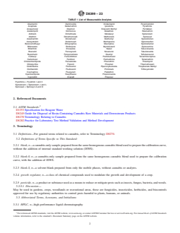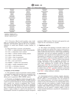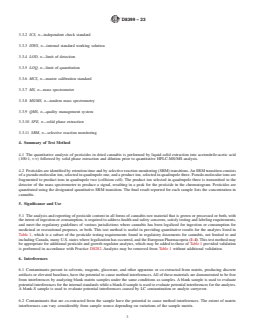 SIGNIFICANCE AND USE 5.1 The analysis and reporting of pesticide content in all forms of cannabis raw material that is grown or processed or both, with the intent of ingestion or consumption, is required to address health and safety concerns, satisfy testing and labeling requirements, and meet the regulatory guidelines of various jurisdictions where cannabis has been legalized for ingestion or consumption for medicinal or recreational purposes, or both. This test method is useful in providing quantitative results for the analytes listed in Table 1, which is a subset of the pesticide testing requirements found in regulatory documents for cannabis, not limited to and including Canada, many U.S. states where legalization has occurred, and the European Pharmacopeia (1-4). This test method may be appropriate for additional pesticide and growth regulator analytes, which may be added to those of Table 1 provided validation is performed in accordance with Practice D8282. Analytes may be removed from Table 1 without additional validation. SCOPE 1.1 This test method allows for the concentration determination of the pesticides listed in Table 1 and shall apply to any dried raw material from a cannabis plant (Note 1, Note 2) regardless of the type of cannabis plant from which it was derived (1, 2).2 For the sake of brevity, the term “cannabis” shall be used from now on to refer to any type of cannabis plant including those which can be classified as hemp. The procedure includes sub-sampling a ground, homogenous sample, liquid-solid extraction with acetonitrile:acetic acid (100:1, v:v), solid phase extraction with C18 SPE media, dilution in 3 mM ammonium formate in water with 0.1 % formic acid and 3 mM ammonium formate in methanol with 0.02 % formic acid in a 20:80 ratio (v:v) and analysis by LC-MS/MS. This procedure encompasses the entire process from sample preparation to analyte quantitation encompassing a range of 0.005 µg/g to 0.500 µg/g. Pyrethrins = Pyrethrin I and II Spinetoram = Spinetoram J and L Spinosad = Spinosyn A and D Note 1: For this test method, dried raw material from a cannabis plant includes one or more of inflorescence, leaves, or stems. Note 2: Certain jurisdictions or regulations may require specific parts of the plant to be included or excluded for analysis and those regulations will take precedence for the selection of plant parts. 1.2 Units—The values stated in SI units are to be regarded as standard. No other units of measurement are included in this standard. 1.3 Table 1 lists the analytes measured by this test method. 1.4 No recommendations found within this test method shall preclude observance of federal, state, or local regulations, which may be more restrictive or have different requirements. 1.5 This standard does not purport to address all of the safety concerns, if any, associated with its use. It is the responsibility of the user of this standard to establish appropriate safety, health, and environmental practices and determine the applicability of regulatory limitations prior to use. 1.6 This international standard was developed in accordance with internationally recognized principles on standardization established in the Decision on Principles for the Development of International Standards, Guides and Recommendations issued by the World Trade Organization Technical Barriers to Trade (TBT) Committee.