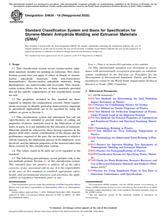 ASTM D4634-16(2022) is a technical specification published by ASTM International. Its full title is "Standard Classification System and Basis for Specification for Styrene-Maleic Anhydride Molding and Extrusion Materials (S/MA)". This standard covers: ABSTRACT This specification covers styrene-maleic anhydride materials suitable for molding and extrusion. It does not however apply to alloys or blends of styrene-maleic anhydride materials with non-elastomeric thermoplastics. The materials shall be conditioned and tested for physical and mechanical properties in the standard laboratory atmosphere. Test specimens and testing parameters for the unreinforced and reinforced, filled, or lubricated materials shall conform to the tensile strength, flexural modulus, Izod impact strength, Vicat softening point, and heat deflection temperature requirements. SCOPE 1.1 This classification system covers styrene-maleic anhydride materials suitable for molding or extrusion. This classification system does not apply to alloys or blends of styrene-maleic anhydride materials with non-elastomeric thermoplastics. Styrene-maleic anhydride materials, being thermoplastic, are reprocessable and recyclable. This classification system allows for the use of those materials provided that all the specific requirements of this classification system are met. 1.2 The properties included in this standard are those required to identify the compositions covered. Other requirements necessary to identify particular characteristics important to specialized applications are to be specified by using the suffixes as given in Section 5. 1.3 This classification system and subsequent line call out (specification) are intended to provide means of calling out properties of plastic materials used in the fabrication of end items or parts. It is not intended for the selection of materials. Materials should be selected by those having expertise in the plastics field after careful consideration of the design and the performance required of the part, the environment to which it will be exposed, the fabrication process to be employed, costs involved, and the inherent properties of the material other than those covered by this classification system. 1.4 The values stated in SI units are to be regarded as the standard. 1.5 The following precautionary caveat pertains only to the test methods portion, Section 11, of this classification system. This standard does not purport to address all of the safety concerns, if any, associated with its use. It is the responsibility of the user of this standard to establish appropriate safety, health, and environmental practices and determine the applicability of regulatory limitations prior to use. Note 1: There is no known ISO equivalent to this standard. 1.6 This international standard was developed in accordance with internationally recognized principles on standardization established in the Decision on Principles for the Development of International Standards, Guides and Recommendations issued by the World Trade Organization Technical Barriers to Trade (TBT) Committee.