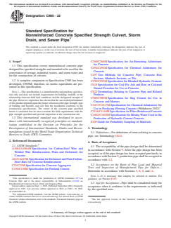 ABSTRACT This specification covers nonreinforced concrete pipe designed for specified strengths and intended to be used for the conveyance of sewage, industrial wastes, and storm water and for the construction of culverts. Strength test and load test shall be made in accordance with the specified requirements. SCOPE 1.1 This specification covers nonreinforced concrete pipe designed for specified strengths and intended to be used for the conveyance of sewage, industrial wastes, and storm water and for the construction of culverts. 1.2 A complete companion to Specification C985 has been developed, C985M; therefore, no metric equivalents are presented in this specification. Note 1: This specification is a manufacturing and purchase specification only and does not include requirements for bedding, backfill, or the relationship between field load conditions and the designated strength of the pipe. However, experience has shown that the successful performance of this product depends upon the proper selection of the pipe strength, type of bedding and backfill, and care that the installation conforms to the construction specifications. The owner of the concrete pipe specified herein is cautioned that he must correlate the field requirements with the pipe strength specified and provide inspection at the construction site. 1.3 This international standard was developed in accordance with internationally recognized principles on standardization established in the Decision on Principles for the Development of International Standards, Guides and Recommendations issued by the World Trade Organization Technical Barriers to Trade (TBT) Committee.