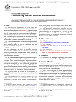 ASTM E750-15(2020) is a standard published by ASTM International. Its full title is "Standard Practice for Characterizing Acoustic Emission Instrumentation". This standard covers: ABSTRACT This practice deals with the testing and measurement of operating characteristics of acoustic emission (AE) electronic components or units. This practice is not intended for routine checks of acoustic emission instrumentation, but rather for periodic evaluation or in the event of a malfunction. The sensor is not addressed in this document other than suggesting methods for standardizing system gains (equalizing them channel to channel) when sensors are present. The test methods and measurement techniques used and their corresponding results should be recorded in documentation, which consists of photographs, charts or graphs, calculations, and tabulations where applicable. This practice does not cover the testing of the computer or computer peripherals used in conjunction with AE systems that use them to control the collection, storage, display, and analysis of data. Instead a manufacturer's specification should be provided for such purpose. SIGNIFICANCE AND USE 5.1 This practice provides information necessary to document the accuracy and performance of an Acoustic Emission system. This information is useful for reference purposes to assure that the instrumentation performance remains consistent with time and use, and provides the information needed to adjust the system to maintain its consistency. 5.2 The methods set forth in this practice are not intended to be either exclusive or exhaustive. 5.3 Difficult or questionable instrumentation measurements should be referred to electronics engineering personnel. 5.4 It is recommended that personnel responsible for carrying out instrument measurements using this practice should be experienced in instrumentation measurements, as well as all the required test equipment being used to make the measurements. SCOPE 1.1 This practice is recommended for use in testing and measuring operating characteristics of acoustic emission electronic components or units. (See Appendix X1 for a description of components and units.) It is not intended that this practice be used for routine checks of acoustic emission instrumentation, but rather for periodic evaluation or in the event of a malfunction. The sensor is not addressed in this document other than suggesting methods for standardizing system gains (equalizing them channel to channel) when sensors are present. 1.2 Where the manufacturer provides testing and measuring details in an operating and maintenance manual, the manufacturer's methods should be used in conjunction with the methods described in this practice. 1.3 The methods (techniques) used for testing and measuring the components or units of acoustic emission instrumentation, and the results of such testing and measuring should be documented. Documentation should consist of photographs, screenshots, charts or graphs, calculations, and tabulations where applicable. 1.4 AE systems that use computers to control the collection, storage, display, and data analysis, might include waveform collection as well as a wide selection of measurement parameters (features) relating to the AE signal. The manufacturer provides a specification for each system that specifies the operating range and conditions for the system. All calibration and acceptance testing of computer-based AE systems must use the manufacturer's specification as a guide. This practice does not cover testing of the computer or computer peripherals. 1.5 The values stated in SI units are to be regarded as standard. No other units of measurement are included in this standard. 1.6 This standard does not purport to address all of the safety concerns, if any, associated with its use. It is the responsibility of the user of this standard to establish appropriate safety, health, and environmental practices and determine the applicability of regulatory limitations prior to use. 1.7 This international standard was developed in accordance with internationally recognized principles on standardiz...