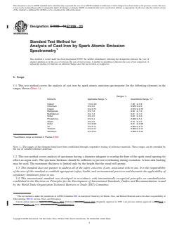 1.1 This test method covers the analysis of cast iron by spark atomic emission spectrometry for the following elements in the ranges shown (Note 1):