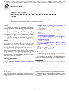 ASTM D5337-23: Standard Practice for Setting and Verifying the Flow Rate of Personal Sampling Pumps specifies procedures for calibrating, setting, and verifying the flow rate of personal air sampling pumps in workplace environments. These pumps are essential tools in occupational exposure assessment, ensuring accurate collection of airborne contaminants for workplace air quality evaluation. The standard outlines best practices to maintain the precision and reliability of sampling equipment through traceable calibration methods and documentation.
