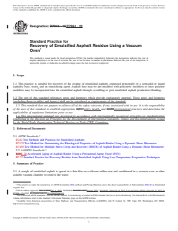 SIGNIFICANCE AND USE 4.1 This practice can be used to obtain residues of emulsified asphalts. The residue may be used for further testing. 4.2 As approximately 5 g of residue is typically obtained, limited testing is possible. Note 1: Rheological characterization as described in Test Methods D7175 and D7405 are suitable test methods. Additional test methods are being developed suited to the small amounts of residue obtained. SCOPE 1.1 This practice is suitable for recovery of the residue of emulsified asphalts composed principally of a semisolid or liquid asphaltic base, water, and an emulsifying agent. Asphalt base may be pre-modified with polymeric modifiers or latex polymer modifiers may be incorporated into the emulsified asphalt through co-milling or post emulsified asphalt production blending. 1.2 The text of this standard references notes and footnotes which provide explanatory material. These notes and footnotes (excluding those in tables and figures) shall not be considered as requirements of the standard. 1.3 This standard does not purport to address all of the safety concerns, if any, associated with its use. It is the responsibility of the user of this standard to establish appropriate safety, health, and environmental practices and determine the applicability of regulatory limitations prior to use. 1.4 This international standard was developed in accordance with internationally recognized principles on standardization established in the Decision on Principles for the Development of International Standards, Guides and Recommendations issued by the World Trade Organization Technical Barriers to Trade (TBT) Committee.