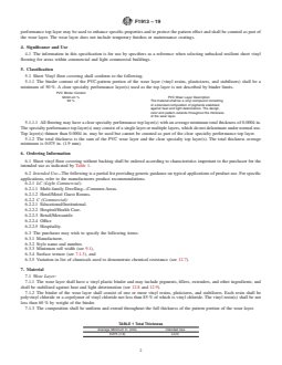 ABSTRACT This specification covers sheet floor covering having a vinyl wear layer without backing. Products also may contain a clear specialty performance top layers. This type of floor covering is intended for use in commercial and light commercial buildings. The wear layer shall have a vinyl plastic binder and may include pigments, fillers, extenders, and other ingredients. This layer shall be stabilized against heat and light deterioration. The binder content of the PVC-pattern portion of the wear layer such as vinyl resins, plasticizers, and stabilizers shall be a minimum of 50 %. SCOPE 1.1 This specification covers sheet floor covering having a vinyl wear layer without backing. Products also may contain a clear specialty performance top layer(s). 1.2 This type of floor covering is intended for use in commercial and light commercial buildings. General information and performance characteristics, which determine serviceability and recommended use, are included in this specification. 1.3 The values stated in inch-pound units are to be regarded as standard. The values given in parentheses are mathematical conversions to SI units that are provided for information only and are not considered standard. 1.4 This standard does not purport to address all of the safety concerns, if any, associated with its use. It is the responsibility of the user of this standard to establish appropriate safety, health, and environmental practices and determine the applicability of regulatory limitations prior to use. 1.5 This international standard was developed in accordance with internationally recognized principles on standardization established in the Decision on Principles for the Development of International Standards, Guides and Recommendations issued by the World Trade Organization Technical Barriers to Trade (TBT) Committee.