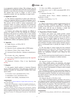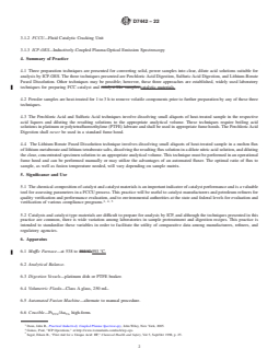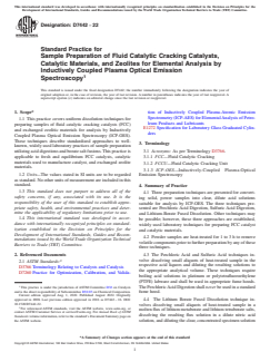 SIGNIFICANCE AND USE 5.1 The chemical composition of catalyst and catalyst materials is an important indicator of catalyst performance and is a valuable tool for assessing parameters in a FCCU process. This practice will be useful to catalyst manufacturers and petroleum refiners for quality verification and performance evaluation, and to environmental authorities at the state and federal levels for evaluation and verification of various compliance programs.3, 4, 5 5.2 Catalysts and catalyst type materials are difficult to prepare for analysis by ICP, and although the techniques presented in this practice are common, there is wide variation among laboratories in sample pretreatment and digestion recipes. This practice is intended to standardize these variables in order to facilitate the utility of comparative data among manufacturers, refiners, and regulatory agencies. SCOPE 1.1 This practice covers uniform dissolution techniques for preparing samples of fluid catalytic cracking catalysts (FCC) and exchanged zeolitic materials for analysis by Inductively Coupled Plasma Optical Emission Spectroscopy (ICP-OES). These techniques describe standardized approaches to well-known, widely used laboratory practices of sample preparation utilizing acid digestions and borate salt fusions. This practice is applicable to fresh and equilibrium FCC catalysts, catalytic materials used to manufacture catalyst, and exchanged zeolite materials. 1.2 Units—The values stated in SI units are to be regarded as standard. No other units of measurement are included in this standard. 1.3 This standard does not purport to address all of the safety concerns, if any, associated with its use. It is the responsibility of the user of this standard to establish appropriate safety, health, and environmental practices and determine the applicability of regulatory limitations prior to use. 1.4 This international standard was developed in accordance with internationally recognized principles on standardization established in the Decision on Principles for the Development of International Standards, Guides and Recommendations issued by the World Trade Organization Technical Barriers to Trade (TBT) Committee.