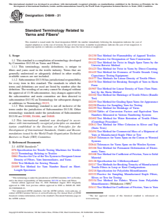ASTM D4849-21 is a standard published by ASTM International. Its full title is "Standard Terminology Related to Yarns and Fibers". This standard covers: SCOPE 1.1 This standard is a compilation of terminology developed by Committee D13.58 on Yarns and Fibers. 1.1.1 This terminology, mostly definitions, is unique to fibers and yarns used in the textile industry. Terms that are generally understood or adequately defined in other readily available sources are not included. 1.1.2 Subcommittee D13.58 has jurisdictional responsibility for every item in this standard. The standards in which the terms and definitions are used are listed by number after the definition. The wording of an entry cannot be changed without the approval of 13.58 subcommittee. Any changes approved by the subcommittee and main committee are then directed to subcommittee D13.92 on Terminology for subsequent changes or additions to Terminology D123. 1.1.3 This terminology standard is not all inclusive of the terms under the jurisdiction of Subcommittee D13.58. Other terminology standards under the jurisdiction of Subcommittee D13.58 are D3888, D4466, and D4848. 1.2 This international standard was developed in accordance with internationally recognized principles on standardization established in the Decision on Principles for the Development of International Standards, Guides and Recommendations issued by the World Trade Organization Technical Barriers to Trade (TBT) Committee.