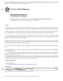 ASTM F2417-23: Standard Specification for Fire Safety for Candles is a key standard developed by ASTM International to improve the fire safety of candles and candle ensembles. This specification sets minimum safety requirements and test methods aimed at reducing fire hazards, personal injuries, and property damage associated with candle use. The document is applicable to various types of candles including freestanding, filled, tealight, religious/ceremonial, gel-containing candles, and candle-making kits.