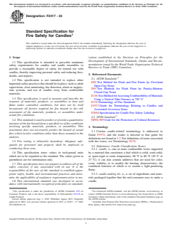 ASTM F2417-23 is a technical specification published by ASTM International. Its full title is "Standard Specification for Fire Safety for Candles". This standard covers: SCOPE 1.1 This specification is intended to prescribe minimum safety requirements for candles and candle ensembles to provide a reasonable degree of safety for normal use with candles, thereby improving personal safety and reducing fires, deaths, and injuries. 1.2 This specification is not intended to replace other important safety practices that should be in place, such as adult supervision, close monitoring, fire detection, alarm or suppression systems, and use of candles away from combustible materials. 1.3 This specification is used to measure and describe the response of materials, products, or assemblies to heat and flame under controlled conditions, but does not by itself incorporate all factors required for fire hazard or fire risk assessment of the materials, products, or assemblies under actual fire conditions. 1.4 This standard is used to predict or provide a quantitative measure of the fire hazard from a specified set of fire conditions involving specific materials, products, or assemblies. This assessment does not necessarily predict the hazard of actual fires which involve conditions other than those assumed in the analysis. 1.5 Fire testing is inherently hazardous. Adequate safeguards for personnel and property shall be employed in conducting these tests. 1.6 This specification states values in inch-pound units which are to be regarded as the standard. The values given in parenthesis are for information only. 1.7 This specification does not purport to address all of the safety concerns, if any, associated with its use. It is the responsibility of the user of this standard to establish appropriate safety, health, and environmental practices and determine the applicability of regulatory requirements prior to use. 1.8 This international standard was developed in accordance with internationally recognized principles on standardization established in the Decision on Principles for the Development of International Standards, Guides and Recommendations issued by the World Trade Organization Technical Barriers to Trade (TBT) Committee.