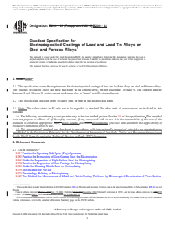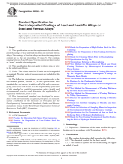 ASTM B200-22 is a technical specification published by ASTM International. Its full title is "Standard Specification for Electrodeposited Coatings of Lead and Lead-Tin Alloys on Steel and Ferrous Alloys". This standard covers: ABSTRACT This specification establishes the requirements for electrodeposited lead and lead-tin alloy coatings on steel and ferrous alloys. Sheets, strips, or wires in the unfabricated form are not covered here. Coatings shall be sampled, tested, and conform accordingly to specified requirements as to thickness, adhesion, corrosion resistance, hydrogen embrittlement, composition, workmanship, finish, and appearance. SIGNIFICANCE AND USE 7.1 Electrodeposits of lead and lead-tin alloys on steel and ferrous alloys are produced where it is desired to obtain atmospheric corrosion resistance. Deposits of lead and lead-tin alloys on steel have shown to have excellent corrosion protective qualities in atmospheric exposure, especially when under-coated by a thin deposit of copper (or nickel). Applications of lead and lead-tin alloy deposits include the following: protection from dilute sulfuric acid; lining of brine refrigeration tanks; chemical apparatus; and parts for storage batteries; and for coating bearing surfaces. In this last application, lead is electroplated alone, or as an alloy and coated with another metal, such as indium. The indium may be diffused into the lead or lead alloy by heat treatment. See Appendix X1. SCOPE 1.1 This specification covers the requirements for electrodeposited coatings of lead and lead-tin alloys on steel and ferrous alloys. The coatings of lead-tin alloys are those that range in tin content up to, but not exceeding, 15 mass %. The coatings ranging between 3 and 15 mass % in tin content are known also as “terne” metallic electrodeposits. 1.2 This specification does not apply to sheet, strip, or wire in the unfabricated form. 1.3 Units—The values stated in SI units are to be regarded as standard. No other units of measurement are included in this standard. 1.4 The following precautionary caveat pertains only to the test method portion, Section 11, of this specification: This standard does not purport to address all of the safety concerns, if any, associated with its use. It is the responsibility of the user of this standard to establish appropriate safety, health, and environmental practices and determine the applicability of regulatory limitations prior to use. 1.5 This international standard was developed in accordance with internationally recognized principles on standardization established in the Decision on Principles for the Development of International Standards, Guides and Recommendations issued by the World Trade Organization Technical Barriers to Trade (TBT) Committee.