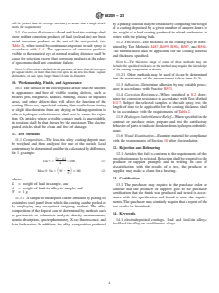 ABSTRACT This specification establishes the requirements for electrodeposited lead and lead-tin alloy coatings on steel and ferrous alloys. Sheets, strips, or wires in the unfabricated form are not covered here. Coatings shall be sampled, tested, and conform accordingly to specified requirements as to thickness, adhesion, corrosion resistance, hydrogen embrittlement, composition, workmanship, finish, and appearance. SIGNIFICANCE AND USE 7.1 Electrodeposits of lead and lead-tin alloys on steel and ferrous alloys are produced where it is desired to obtain atmospheric corrosion resistance. Deposits of lead and lead-tin alloys on steel have shown to have excellent corrosion protective qualities in atmospheric exposure, especially when under-coated by a thin deposit of copper (or nickel). Applications of lead and lead-tin alloy deposits include the following: protection from dilute sulfuric acid; lining of brine refrigeration tanks; chemical apparatus; and parts for storage batteries; and for coating bearing surfaces. In this last application, lead is electroplated alone, or as an alloy and coated with another metal, such as indium. The indium may be diffused into the lead or lead alloy by heat treatment. See Appendix X1. SCOPE 1.1 This specification covers the requirements for electrodeposited coatings of lead and lead-tin alloys on steel and ferrous alloys. The coatings of lead-tin alloys are those that range in tin content up to, but not exceeding, 15 mass %. The coatings ranging between 3 and 15 mass % in tin content are known also as “terne” metallic electrodeposits. 1.2 This specification does not apply to sheet, strip, or wire in the unfabricated form. 1.3 Units—The values stated in SI units are to be regarded as standard. No other units of measurement are included in this standard. 1.4 The following precautionary caveat pertains only to the test method portion, Section 11, of this specification: This standard does not purport to address all of the safety concerns, if any, associated with its use. It is the responsibility of the user of this standard to establish appropriate safety, health, and environmental practices and determine the applicability of regulatory limitations prior to use. 1.5 This international standard was developed in accordance with internationally recognized principles on standardization established in the Decision on Principles for the Development of International Standards, Guides and Recommendations issued by the World Trade Organization Technical Barriers to Trade (TBT) Committee.