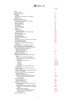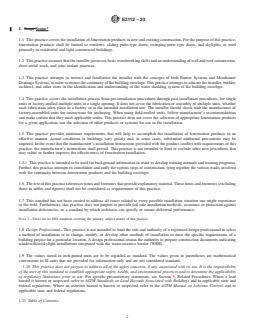 ASTM E2112-23 is a standard published by ASTM International. Its full title is "Standard Practice for Installation of Exterior Windows, Doors and Skylights". This standard covers: SIGNIFICANCE AND USE 4.1 This practice recognizes that the effective performance of installed fenestration products is dependent in part upon following proper installation procedures and appropriate workmanship. 4.2 This practice recognizes that the coordination of trades and proper sequencing are essential for effective fenestration installation. The general contractor shall be responsible for the necessary coordination of trades and proper construction sequencing of the installed fenestration product. 4.3 Improper installation of units contributes to excessive air, water and sound leakage, and condensation. It may promote the deterioration of wall constructions, insulation, fenestration products, and their respective finishes. 4.4 This practice presumes a working knowledge of applicable federal, state, and local codes and regulations, specifically, but not limited to required means of egress, requirements for safety glazing materials, and structural requirements of applicable codes. 4.5 This practice presumes a working knowledge of the tools, equipment, and methods necessary for the installation of specified fenestration products. It further assumes familiarity with flashing and sealing, glazing procedures, finishes where applicable, and an understanding of the fundamentals of construction that affect the installation of these units. 4.6 This practice presumes that the products that have been furnished for the installation and their locations within the structure comply with all the applicable building codes and regulations. SCOPE 1.1 This practice covers the installation of fenestration products in new and existing construction. For the purpose of this practice, fenestration products shall be limited to windows, sliding patio-type doors, swinging patio type doors, and skylights, as used primarily in residential and light commercial buildings. 1.2 This practice assumes that the installer possesses basic woodworking skills and an understanding of wall and roof construction, sheet metal work, and joint sealant practices. 1.3 This practice attempts to instruct and familiarize the installer with the concepts of both Barrier Systems and Membrane/Drainage Systems, in order to ensure the continuity of the building envelope. This practice attempts to educate the installer, builder, architect, and other users in the identification and understanding of the water shedding system of the building envelope. 1.4 This practice covers the installation process from pre-installation procedures through post-installation procedures, for single units or factory-mulled multiple units in a single opening. It does not cover the fabrication or assembly of multiple units, whether such fabrication takes place in a factory or at the intended installation site. The installer should check with the manufacturer of factory-assembled units for instructions for anchoring. When using field-mulled units, follow manufacturer's recommendations and make certain that they meet applicable codes. This practice does not cover the selection of appropriate fenestration products for a given application, nor the selection of other products or systems for use in the installation. 1.5 This practice provides minimum requirements that will help to accomplish the installation of fenestration products in an effective manner. Actual conditions in buildings vary greatly and, in some cases, substantial additional precautions may be required. In the event that the manufacturer's installation instructions provided with the product conflict with requirements of this practice, the manufacturer's instructions shall prevail. This practice is not intended to limit or exclude other new procedures that may refine or further improve the effectiveness of fenestration installation. 1.5.1 This practice is intended to be used for background information in order to develop training manuals and training programs. Further, this practice attempts to cons...