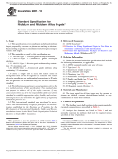 ASTM B391-18 is a technical specification published by ASTM International. Its full title is "Standard Specification for Niobium and Niobium Alloy Ingots". This standard covers: ABSTRACT This specification covers unalloyed and alloyed niobium ingots prepared by vacuum- or plasma-arc melting or electron-beam melting to produce consolidated metal for processing to various mill shapes. The materials covered by this specification are R04200-Type 1 which is a reactor grade unalloyed niobium, R04210-Type 2 which is a commercial grade unalloyed niobium, R04251-Type 3 which is a reactor grade niobium alloy, and R04261-Type 4 which is a commercial grade niobium alloy. The ingot metal for all four types shall be vacuum or plasma arc melted, vacuum electron-beam melted, or any combination of these three methods. The materials shall conform to the required chemical composition for carbon, nitrogen, oxygen, hydrogen, zirconium, tantalum, iron, silicon, tungsten, nickel, molybdenum, hafnium, titanium, boron, aluminum, beryllium, chromium, and cobalt. The ingots shall also conform to the required maximum Brinell hardness. SIGNIFICANCE AND USE 10.1 For the purpose of determining compliance with the specified limits for requirements of the properties listed in the following tables, an observed value or a calculated value shall be rounded as indicated in accordance with the rounding method of Practice E29. SCOPE 1.1 This specification covers unalloyed and alloyed niobium ingots prepared by vacuum- or plasma-arc melting or electron-beam melting to produce consolidated metal for processing to various mill shapes. 1.2 The materials covered by this specification are: 1.2.1 R04200-Type 1—Reactor grade unalloyed niobium, 1.2.2 R04210-Type 2—Commercial grade unalloyed niobium, 1.2.3 R04251-Type 3—Reactor grade niobium alloy containing 1 % zirconium, and 1.2.4 R04261-Type 4—Commercial grade niobium alloy containing 1 % zirconium. 1.3 Unless a single unit is used, the values stated in inch-pound units are to be regarded as standard. The values given in parentheses are mathematical conversions to SI units that are provided for information only and are not considered standard. 1.4 The following precautionary caveat pertains only to the test method portions of this specification: This standard does not purport to address all of the safety concerns, if any, associated with its use. It is the responsibility of the user of this standard to establish appropriate safety, health, and environmental practices and determine the applicability of regulatory limitations prior to use. 1.5 This international standard was developed in accordance with internationally recognized principles on standardization established in the Decision on Principles for the Development of International Standards, Guides and Recommendations issued by the World Trade Organization Technical Barriers to Trade (TBT) Committee.