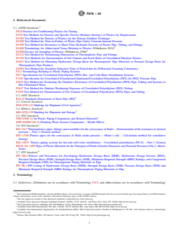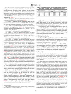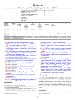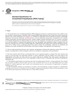 ABSTRACT This specification covers crosslinked polyethylene (PEX) tubing that is outside diameter controlled, made in standard thermoplastic tubing dimension ratios, and pressure rated for water at three temperatures. This specification covers one PEX tubing material in one standard dimension ratio and having pressure ratings for water of three temperatures. The pressure ratings decrease as the temperature is increased. PEX tubing shall be made from polyethylene compounds which have been crosslinked by peroxides, Azo compounds, or silane compounds in extrusion, or by electron beam after extrusion, or by other means such that the tubing meets the performance requirements. The following tests shall be performed: dimensions and tolerances; density; sustained pressure test; burst pressure; environmental stress cracking test; degree of crosslinking; stabilizer functionality; and oxidative stability in potable chlorinated water applications. SCOPE 1.1 This specification covers crosslinked polyethylene (PEX) tubing that incorporates an optional polymeric inner, middle or outer layer and that is outside diameter controlled, made in nominal SDR9 tubing dimension ratios except where noted, and pressure rated for water at three temperatures (see Appendix X1). Included are requirements and test methods for material, workmanship, dimensions, burst pressure, hydrostatic sustained pressure, excessive temperature and pressure, environmental stress cracking, stabilizer functionality, bent-tube hydrostatic pressure, oxidative stability in potable chlorinated water, UV resistance, and degree of crosslinking. Requirements for tubing markings are also given. The components covered by this specification are intended for use in, but not limited to, residential and commercial, hot- and cold-potable water distribution systems, reclaimed water, fire protection, municipal water service lines, building supply lines, radiant heating and cooling systems, hydronic distribution systems, snow and ice melting systems, geothermal ground loops, district heating, turf conditioning, compressed air distribution and building services pipe, provided that the PEX tubing covered herein complies with applicable code requirements. 1.2 The text of this specification references notes, footnotes, and appendixes which provide explanatory material. These notes and footnotes (excluding those in tables and figures) shall not be considered as requirements of the specification. 1.3 The values stated in either SI units or inch-pound units are to be regarded separately as standard. The values stated in each system are not necessarily exact equivalents; therefore, to ensure conformance with the standard, each system shall be used independently of the other, and values from the two systems shall not be combined. The values given in parentheses are mathematical conversions that may not be exact equivalents to either SI units or inch-pound units and that are provided for information only. 1.4 The following safety hazards caveat pertains only to the test methods portion, Section 7, of this specification: This standard does not purport to address all of the safety concerns, if any, associated with its use. It is the responsibility of the user of this standard to establish appropriate safety, health, and environmental practices and determine the applicability of regulatory limitations prior to use. 1.5 This international standard was developed in accordance with internationally recognized principles on standardization established in the Decision on Principles for the Development of International Standards, Guides and Recommendations issued by the World Trade Organization Technical Barriers to Trade (TBT) Committee.