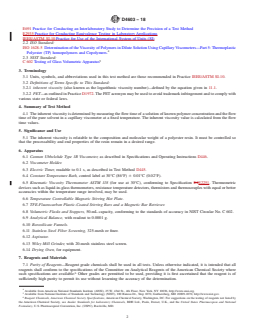 SIGNIFICANCE AND USE 5.1 The inherent viscosity is relatable to the composition and molecular weight of a polyester resin. It must be controlled so that the processability and end properties of the resin remain in a desired range. SCOPE 1.1 This test method is for the determination of the inherent viscosity of poly(ethylene terephthalate) (PET) soluble at 0.50 % concentration in a 60/40 phenol/1,1,2,2-tetrachloroethane solution by means of a glass capillary viscometer. Highly crystalline forms of PET that are not soluble in this solvent mixture will require a different procedure. 1.2 The inherent viscosity values obtained by this test method are comparable with those obtained using differential viscometry described in Test Method D5225. 1.3 The values stated in SI units are to be regarded as the standard. The values given in parentheses are for information only. 1.4 This standard does not purport to address all of the safety concerns, if any, associated with its use. It is the responsibility of the user of this standard to establish appropriate safety, health, and environmental practices and determine the applicability of regulatory limitations prior to use. Specific hazards statements are given in Section 8. 1.4.1 Warning—Mercury has been designated by many regulatory agencies as a hazardous material that can cause serious medical issues. Mercury, or its vapor, has been demonstrated to be hazardous to health and corrosive to materials. Caution should be taken when handling mercury and mercury containing products. See the applicable product Safety Data Sheet (SDS) for additional information. Users should be aware that selling mercury and/or mercury containing products into your state or country may be prohibited by law Note 1: This standard and ISO 1628-5 address the same subject matter, but differ in technical content. This ISO standard gives an option of solvents for PET. Solvent specified in this ASTM test method is one of the options in the ISO method. ISO also uses Type 1C Ubbelohde viscometer, rather than the 1B, and reports viscosity number, rather than inherent viscosity. 1.5 This international standard was developed in accordance with internationally recognized principles on standardization established in the Decision on Principles for the Development of International Standards, Guides and Recommendations issued by the World Trade Organization Technical Barriers to Trade (TBT) Committee.