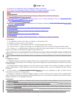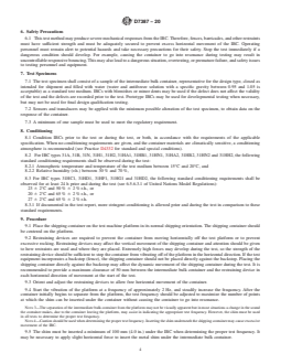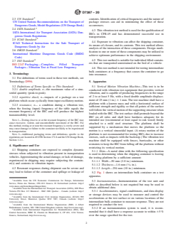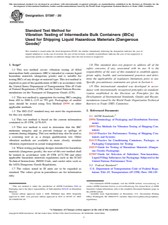 SIGNIFICANCE AND USE 4.1 Shipping containers are exposed to complex dynamic stresses when subjected to vibration present in transportation vehicles. Approximating the actual damage, or lack of damage, experienced in shipping may require subjecting the container(s) and contents to vibration inputs. 4.2 Resonant responses during shipment can be severe and may lead to failure of the container and spillage or leakage of contents. Identification of critical frequencies and the nature of package stresses can aid in minimizing the effect of these occurrences. 4.3 This vibration test method is used for the qualification of IBCs in CFR 49 and has demonstrated successful use in transportation. 4.4 Exposure to vibration can affect the shipping container, its means of closure, and its contents. This test method allows analysis of the interaction of these components. Design modification to one or more of these components may be utilized to achieve optimum performance in the shipping environment. 4.5 This test method is suitable for individual filled containers that are transported unrestrained on the bed of a vehicle. 4.6 This test method is not intended for testing intermediate bulk containers at a frequency that causes the container to go into resonance. SCOPE 1.1 This test method covers vibration testing of filled intermediate bulk containers (IBCs) intended to contain liquid hazardous materials (dangerous goods) and is suitable for testing IBCs of any design or material type. This test method is required as part of the qualification of IBCs in accordance with the United States Department of Transportation Title 49 Code of Federal Regulations (CFR) and the United Nations Recommendations on the Transport of Dangerous Goods (UN). 1.2 This test method is appropriate for testing IBCs ranging from 450 to 3000 L (119 to 793 gal). Packagings of smaller sizes should be tested using Test Method D999 or other applicable methods. 1.3 The ISO 2247 standard may not meet the requirements for this test method. 1.4 This test method is based on the current information contained in 49 CFR, §178.819. 1.5 This test method is used to determine that the IBC maintains integrity and to prevent leakage or spillage of contents during shipping. This test method may also be used as a screening tool or as a design qualification test. Other vibration methods are available to more closely simulate vibration experienced in actual transportation. 1.6 When testing packaging designs intended for hazardous materials (dangerous goods), the user of this test method shall be trained in accordance with 49 CFR §172.700 and other applicable hazardous materials regulations such as the ICAO Technical Instructions, IMDG Code, and carrier rules such as the IATA Dangerous Goods Regulations. 1.7 The values stated in SI units are to be regarded as standard. The values given in parentheses are for information only. 1.8 This standard does not purport to address all of the safety concerns, if any, associated with its use. It is the responsibility of the user of this standard to establish appropriate safety, health, and environmental practices and determine the applicability of regulatory limitations prior to use. Specific precautionary statements are given in Section 6. 1.9 This international standard was developed in accordance with internationally recognized principles on standardization established in the Decision on Principles for the Development of International Standards, Guides and Recommendations issued by the World Trade Organization Technical Barriers to Trade (TBT) Committee.