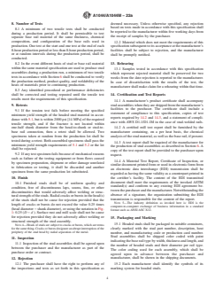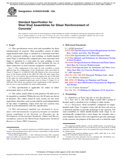 ASTM A1044/A1044M-22a is a technical specification published by ASTM International. Its full title is "Standard Specification for Steel Stud Assemblies for Shear Reinforcement of Concrete". This standard covers: SCOPE 1.1 This specification covers steel stud assemblies for shear reinforcement of concrete. Stud assemblies consist of either single-headed studs (Type 1) attached to a structural steel base rail by structural welding or stud welding, or double-headed studs (Type 2) mechanically crimped into a non-structural steel shape or attached to a steel plate by spot welding or tack welding. These stud assemblies are not intended for use as shear connectors in steel-concrete composite construction. Note 1: The configuration of the studs for stud assemblies is much different than the configuration of the headed-type studs prescribed in Clause 9, Figure 9.1 of AWS D1.1/D1.1M. Ratios of the cross-sectional areas of the head-to-shank of the AWS D1.1/D1.1M studs range from about 2.5 to 4. In contrast, this specification requires the area of the head of the studs for stud assemblies to be at least 10 times the area of the shank. Thus, the standard headed-type studs in Clause 9, Figure 9.1 of AWS D1.1/D1.1M do not conform to the requirements of this specification for use as stud assemblies for shear reinforcement. 1.2 This specification is applicable for orders in either inch-pound units or in SI units. 1.3 The values stated either in inch-pound or SI units are to be regarded as standard. Within the text, the SI units are shown in brackets. The values stated in each system are not exact equivalents; therefore, each system shall be used independently of the other. Combining values from the two systems may result in nonconformance with this specification. 1.4 This international standard was developed in accordance with internationally recognized principles on standardization established in the Decision on Principles for the Development of International Standards, Guides and Recommendations issued by the World Trade Organization Technical Barriers to Trade (TBT) Committee.