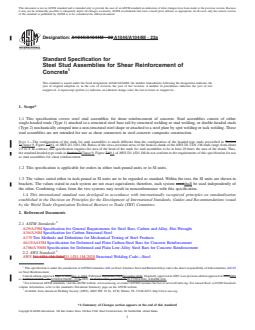 SCOPE 1.1 This specification covers steel stud assemblies for shear reinforcement of concrete. Stud assemblies consist of either single-headed studs (Type 1) attached to a structural steel base rail by structural welding or stud welding, or double-headed studs (Type 2) mechanically crimped into a non-structural steel shape or attached to a steel plate by spot welding or tack welding. These stud assemblies are not intended for use as shear connectors in steel-concrete composite construction. Note 1: The configuration of the studs for stud assemblies is much different than the configuration of the headed-type studs prescribed in Clause 9, Figure 9.1 of AWS D1.1/D1.1M. Ratios of the cross-sectional areas of the head-to-shank of the AWS D1.1/D1.1M studs range from about 2.5 to 4. In contrast, this specification requires the area of the head of the studs for stud assemblies to be at least 10 times the area of the shank. Thus, the standard headed-type studs in Clause 9, Figure 9.1 of AWS D1.1/D1.1M do not conform to the requirements of this specification for use as stud assemblies for shear reinforcement. 1.2 This specification is applicable for orders in either inch-pound units or in SI units. 1.3 The values stated either in inch-pound or SI units are to be regarded as standard. Within the text, the SI units are shown in brackets. The values stated in each system are not exact equivalents; therefore, each system shall be used independently of the other. Combining values from the two systems may result in nonconformance with this specification. 1.4 This international standard was developed in accordance with internationally recognized principles on standardization established in the Decision on Principles for the Development of International Standards, Guides and Recommendations issued by the World Trade Organization Technical Barriers to Trade (TBT) Committee.