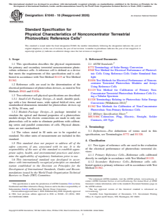 ASTM E1040-10(2020) is a technical specification published by ASTM International. Its full title is "Standard Specification for Physical Characteristics of Nonconcentrator Terrestrial Photovoltaic Reference Cells". This standard covers: ABSTRACT This specification describes the physical requirements for primary and secondary nonconcentrator terrestrial phorovoltaic reference cells based on small-cell package design and module-package design. These requirements include those for product marking, reference cell material, window, configuration, electrical connectors, and temperature sensor. SCOPE 1.1 This specification describes the physical requirements for primary and secondary terrestrial nonconcentrator photovoltaic reference cells. A reference cell is defined as a device that meets the requirements of this specification and is calibrated in accordance with Test Method E1125 or Test Method E1362. 1.2 Reference cells are used in the determination of the electrical performance of photovoltaic devices, as stated in Test Methods E948 and E1036. 1.3 Two reference cell physical specifications are described: 1.3.1 Small-Cell Package Design—A small, durable package with a low thermal mass, wide optical field-of-view, and standardized dimensions intended for photovoltaic devices up to 20 by 20 mm, and 1.3.2 Module-Package Design—A package intended to simulate the optical and thermal properties of a photovoltaic module design, but electric connections are made to only one photovoltaic cell in order to eliminate problems with calibrating series and parallel connections of cells. Physical dimensions are not standardized. 1.4 The values stated in SI units are to be regarded as standard. No other units of measurement are included in this standard. 1.5 This standard does not purport to address all of the safety concerns, if any, associated with its use. It is the responsibility of the user of this standard to establish appropriate safety, health, and environmental practices and determine the applicability of regulatory limitations prior to use. 1.6 This international standard was developed in accordance with internationally recognized principles on standardization established in the Decision on Principles for the Development of International Standards, Guides and Recommendations issued by the World Trade Organization Technical Barriers to Trade (TBT) Committee.