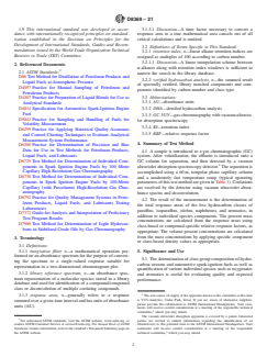 SIGNIFICANCE AND USE 5.1 The determination of class group composition of hydrocarbon streams and automotive spark-ignition fuels as well as quantification of various individual species such as oxygenates and aromatics is useful for evaluating quality and expected performance. SCOPE 1.1 This test method covers the use of gas chromatography and vacuum ultraviolet absorption spectroscopy (GC-VUV) for the determination of individual compounds and compound classes by percent mass or percent volume with a final boiling point as defined by Test Method D86 up to 225 °C. 1.1.1 Typical products encountered in petroleum refining or biofuel operations, such as blend stocks; naphthas, reformates, alkylates, FCC gasoline, liquefied petroleum gas (LPG), alcohols and ethers may be analyzed. 1.1.2 Spark-ignition engine fuels including those with commonly blended oxygenates may also be analyzed. 1.2 Individual compounds are spectrally verified and speciated. Compounds that are not spectrally verified and speciated are identified by carbon number, based on retention index, and by class type, based on spectral response. The resulting verified hydrocarbon analysis therefore identifies, classifies, and reports 100 % of the spectral responses. 1.2.1 This test method may not be applicable to all concentrations of individual hydrocarbons; the user must evaluate the spectral response of the hydrocarbon of interest, the amount and proximity of co-eluting hydrocarbons, and detector saturation. Quantitation of individual hydrocarbons with concentrations less than 0.1 % or greater than 30 % by mass may require validation. 1.2.2 This test method can be used to determine methanol in the range of 0.05 % to 3 % by mass, ethanol in the range of 0.05 % to 25 % by mass, butanols in the range of 0.5 % to 10 % by mass, methyl t-butyl ether (MTBE) in the range of 0.5 % to 22 % by mass, ethyl t-butyl ether (ETBE) in the range of 0.5 % to 22 % by mass, and t-amyl methyl ether (TAME) in the range of 0.5 % to 22 % by mass in spark-ignition engine fuels. Note 1: Applicable ranges of individual components and precision will ultimately be defined by an interlaboratory study. 1.2.3 Other compounds containing oxygen, sulfur, nitrogen, and so forth, may also be present, and may co-elute with the hydrocarbons. If determination of other specific compounds is required, supplementation of the spectral library may be necessary. 1.3 Class-type composition – paraffins, iso-paraffins, olefins, naphthenes, aromatics and oxygenates are reported. The class composition totals are the sum of speciated individual compounds and spectrally classed compounds. 1.3.1 The class types may optionally be sub classed by carbon number. 1.3.2 Olefins may optionally be sub classed into mono-olefins, non-conjugated diolefins, conjugated diolefins, and cyclic olefins. 1.3.3 Aromatics may optionally be sub classed into mono-aromatics, diaromatics, and naphtheno-aromatics (indans and indenes). Note 2: Interim precision for optional sub class reporting is not determined. 1.4 Individual compounds may not be baseline-separated by the procedure described in this method; that is, some compounds will coelute. The coelutions are resolved at the detector using VUV absorbance spectra and deconvolution algorithms. 1.5 This test method is intended as a type of detailed hydrocarbon analysis (DHA). Incorporation of the GC-VUV data report into commercial DHA software packages with subsequent physical and chemical property calculations and correlations is the responsibility of the DHA software vendor. 1.6 Temporary precision has been determined on a limited subset of samples and compounds given in Table 6 and Table 7. 1.7 Units—The values stated in SI units are to be regarded as standard. No other units of measurement are included in this standard. 1.8 This standard does not purport to address all of the safety concerns, if any, associated with its use. It ...