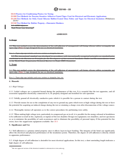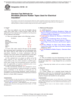 ASTM D2148-22: Standard Test Methods for Bondable Silicone Rubber Tapes Used for Electrical Insulation specifies a comprehensive range of test methods to evaluate the properties and performance of bondable silicone rubber tapes. These tapes are essential in electrical insulation applications where self-adhesion and the resulting sealed structure are critical to maintaining electrical and physical integrity. The standard includes procedures for evaluating self-adhesion, bond strength, dielectric breakdown voltage, hardness, and dimensional properties, providing a robust framework for product qualification and quality control in electrical insulation materials.
