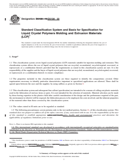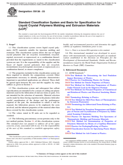 SCOPE 1.1 This classification system covers liquid crystal polymeric (LCP) materials suitable for injection molding and extrusion. This classification system allows the use of liquid crystal polymers that are recycled, reconstituted, recycled-regrind, recovered, or reprocessed, or a combination thereof, provided that the requirements as stated in this classification system are met. It is the responsibility of the supplier and the buyer of liquid crystal polymers that are recycled, reconstituted, recycled-regrind, recovered, or reprocessed, or a combination thereof, to ensure compliance. 1.2 The properties included in this classification system are those required to identify the compositions covered. Other requirements necessary to identify particular characteristics important to specialized applications are allowed. These shall be agreed upon between the user and the supplier, by using suffixes as given in Section 5. 1.3 This classification system and subsequent line callout (specification) are intended to be a means of calling out plastic materials used in the fabrication of end-use items or parts. It is not intended for the selection of materials. Material selection can be made by those having expertise in the plastics field after careful consideration of the design and the performance required of the part, the environment to which it will be exposed, the fabrication process to be employed, the costs involved, and the inherent properties of the material other than those covered by this classification system. 1.4 The values stated in SI units are to be regarded as standard. 1.5 The following precautionary caveat pertains only to the test method portion, Section 11, of this classification system: This standard does not purport to address all of the safety concerns, if any, associated with its use. It is the responsibility of the user of this standard to establish appropriate safety, health, and environmental practices and determine the applicability of regulatory limitations prior to use. Note 1: There is no known ISO equivalent to this standard. 1.6 This international standard was developed in accordance with internationally recognized principles on standardization established in the Decision on Principles for the Development of International Standards, Guides and Recommendations issued by the World Trade Organization Technical Barriers to Trade (TBT) Committee.