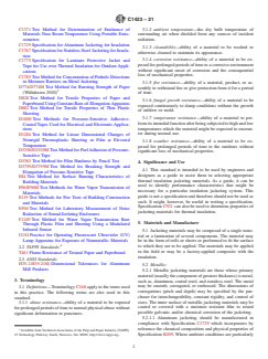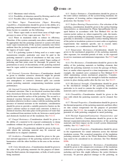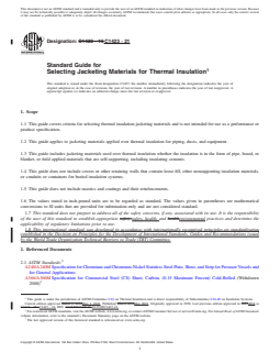 SIGNIFICANCE AND USE 4.1 This standard is intended to be used by engineers and designers as a guide to assist them in selecting appropriate thermal insulation jacketing materials. As a guide, it can be used to identify performance characteristics that might be necessary for a particular insulation jacketing system. This guide is not a specification and therefore should not be used as such. It might, however, be useful in writing a specification. Specification C921 can also be used to determine properties of jacketing materials for thermal insulation. SCOPE 1.1 This guide covers criteria for selecting thermal insulation jacketing materials and is not intended for use as a performance or product specification. 1.2 This guide applies to jacketing materials applied over thermal insulation for piping, ducts, and equipment. 1.3 This guide includes jacketing materials used over thermal insulation whether the insulation is in the form of pipe, board, or blanket, or field applied materials that are self-supporting, including insulating cements. 1.4 This guide does not include covers or other retaining walls that contain loose fill, other nonsupporting insulation materials, or conduits or containers for buried insulation systems. 1.5 This guide does not include mastics and coatings and their reinforcements. 1.6 The values stated in inch-pound units are to be regarded as standard. The values given in parentheses are mathematical conversions to SI units that are provided for information only and are not considered standard. 1.7 This standard does not purport to address all of the safety concerns, if any, associated with its use. It is the responsibility of the user of this standard to establish appropriate safety, health, and environmental practices and determine the applicability of regulatory limitations prior to use. 1.8 This international standard was developed in accordance with internationally recognized principles on standardization established in the Decision on Principles for the Development of International Standards, Guides and Recommendations issued by the World Trade Organization Technical Barriers to Trade (TBT) Committee.