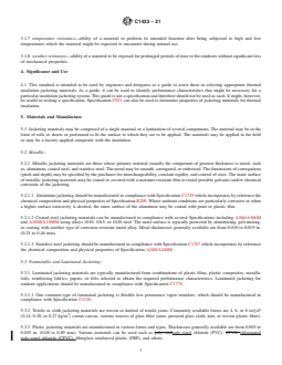 Keywords: jacketing materials, thermal insulation, metallic jacketing, nonmetallic jacketing, vapor retarder, abuse resistance, corrosion resistance, ASTM C1423-21.