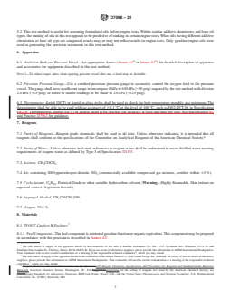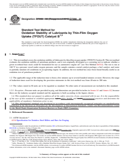 SIGNIFICANCE AND USE 5.1 This test method was originally developed to evaluate oxidation stability of lubricating base oils combined with additives chemistries similar to those found in gasoline engine oils and service.2 5.2 This test method is useful for screening formulated oils before engine tests. Within similar additive chemistries and base oil types, the ranking of oils in this test appears to be predictive of ranking in certain engine tests. When oils having different additive chemistries or base oil type are compared, results may or may not reflect results in engine tests. Only gasoline engine oils were used in generating the precision statements in this test method. SCOPE 1.1 This test method covers the oxidation stability of lubricants by thin-film oxygen uptake (TFOUT) Catalyst B. This test method evaluates the oxidation stability of petroleum products, and it was originally developed as a screening test to indicate whether a given re-refined base stock could be formulated for use as automotive engine oil3 (see Test Method D4742). The test is run at 160 °C in a pressure vessel under oxygen pressure, and the sample contains a metal catalyst package, a fuel catalyst, and water to partially simulate oil conditions in an operating engine. In addition, the test method has since been found broadly useful as an oxidation test of petroleum products.4 1.2 The applicable range of the induction time is from a few minutes up to several hundred minutes or more. However, the range of induction times used for developing the precision statements in this test method was from 40 min to 280 min. 1.3 The values stated in SI units are to be regarded as standard. No other units of measurement are included in this standard. 1.3.1 Exception—Pressure units are provided in psig, and dimensions are provided in inches in Annex A1 and Annex A2, because these are the industry accepted standard and the apparatus is built according to the figures shown. 1.4 This standard does not purport to address all of the safety concerns, if any, associated with its use. It is the responsibility of the user of this standard to establish appropriate safety, health, and environmental practices and determine the applicability of regulatory limitations prior to use. 1.5 This international standard was developed in accordance with internationally recognized principles on standardization established in the Decision on Principles for the Development of International Standards, Guides and Recommendations issued by the World Trade Organization Technical Barriers to Trade (TBT) Committee.