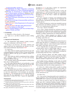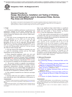 ASTM F2375-09(2017) is a standard published by ASTM International. Its full title is "Standard Practice for Design, Manufacture, Installation and Testing of Climbing Nets and Netting/Mesh used in Amusement Rides, Devices, Play Areas and Attractions". This standard covers: ABSTRACT This practice establishes performance specifications and performance standards for the design, manufacture, installation, and testing of climbing nets and netting/mesh used in amusement rides, devices, play areas and attractions. The materials are: hardware and structures, climb nets, barrier nets, fire retardant, no-hold netting, debris net, and safety nets. Netted areas shall be designed and constructed or assembled so that any accessible net opening shall meet the performance requirements and test requirements. The following tests procedures shall be done: in place test for climb net or barrier net, prototype test for barrier and no-hold netting, prototype test for maximum hole size of no-hold netting, prototype test for a safety net, test for hard nodes, and test for nets with large openings. Installation shall meet the requirements for attachments, fasteners and hardware, and operational performance specified here. SCOPE 1.1 This practice establishes performance specifications and performance standards for the design, manufacturing, and maintenance of netting and or mesh used in play areas and systems designed for interactive play activities within amusement attractions. 1.2 The range of users encompassed by this safety performance specification is 32 in. (0.81 m) (2 years old, 5th percentile) through 50 in. (1.27 m) (8 years old, 50th percentile), 50 in. (1.27 m) (8 years old, 50th percentile) through 64 in. (1.62 m) (12 years old 95th percentile), 32 in. (0.81 m) (2 years old, 5th percentile) through 64 in. (1.62 m) (12 years old, 95th percentile), and 64 in. (1.62 m) (12-year old, 95th percentile) through adult. 1.3 The ages listed in this standard are intended to be used as a guide for determining activities and use. The height requirements are the governing factor. 1.4 Home playground equipment, matrix nets, nets used as/or in fencing, sports equipment, fitness equipment, playground equipment covered by Consumer Safety Performance Specification F1487 and soft contained play equipment (SCPE) covered by Safety Performance Specification F1918 in areas not covered by F24 standards are not included in this standard. 1.5 This practice includes an appendix (non-mandatory), which provides additional information (for example, rationale, background, interpretations, drawings, commentary, and so forth.) to improve the user’s understanding and application of the criteria presented in this practice. The appendix information shall not be interpreted as mandatory design criteria. 1.6 This standard is intended for new climb areas and major modifications. 1.7 Existing climb areas may qualify as compliant for five years following the date of this publication of this practice as long as any significant design related failures or significant design related safety issues have been mitigated. Thereafter, climb areas must qualify as “Service Proven” per Practice F2291 or meet the requirements of this practice. 1.8 The values stated in inch-pound units are to be regarded as standard. The values given in parentheses are mathematical conversions to SI units that are provided for information only and are not considered standard. 1.9 This standard does not purport to address all of the safety concerns, if any, associated with its use. It is the responsibility of the user of this standard to establish appropriate safety and health practices and determine the applicability of regulatory limitations prior to use. 1.10 This international standard was developed in accordance with internationally recognized principles on standardization established in the Decision on Principles for the Development of International Standards, Guides and Recommendations issued by the World Trade Organization Technical Barriers to Trade (TBT) Committee.