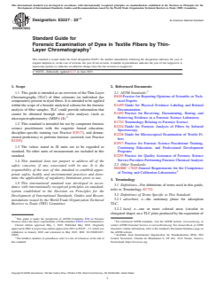 ASTM E2227-23e1 is a guide published by ASTM International. Its full title is "Standard Guide for Forensic Examination of Dyes in Textile Fibers by Thin-Layer Chromatography". This standard covers: SIGNIFICANCE AND USE 5.1 TLC is an inexpensive and simple technique that could be used to complement other analytical techniques within a general analytical scheme related to forensic fiber examination. 5.2 Consider the forensic analysis of fiber colorants using TLC for single fiber comparisons only when the sample size is adequate (that is, enough colorant can be extracted for analysis) and it is not possible to discriminate between the fibers of interest using other techniques, such as comparison microscopy and MSP. Larger fibrous units (for example, thread or tuft) can be treated as an individual sample if determined to be homogeneous. Do not treat fibers that cannot be directly related to each other as a collective sample for the purposes of TLC. 5.3 The extraction procedures carried out prior to TLC analysis can provide useful information about dye classification. TLC can provide qualitative information about dye components. Similar colors made up of different dye components can be differentiated using this technique. The application of TLC may serve to discriminate between fibers or it may support the possibility of fibers sharing a common source. 5.4 TLC can be prohibitively difficult or undesirable in some circumstances. Short lengths of fibers or pale-colored fibers can lack adequate amounts of colorant necessary to be examined by TLC. Dye extraction from some fibers can be impossible (2, 3). Some fiber types do not truly extract, but change or lose color. Reactive dyes are covalently bonded to the fiber and typically cannot be removed by conventional extraction methods, but can be released from cotton and wool by disrupting the fiber by enzymatic or chemical digestion, respectively (1). The desire to preserve evidence from deleterious change or for possible analysis by another examiner can preclude removing the color or employing a destructive method for analysis. SCOPE 1.1 This guide is intended as an overview of the Thin-Layer Chromatography (TLC) of fiber colorants (or individual dye components) present in dyed fibers. It is intended to be applied within the scope of a broader analytical scheme for the forensic analysis of fiber samples. TLC could provide information that cannot be obtained through other color analyses (such as microspectrophotometry (MSP)) (1).2 1.2 This standard is intended for use by competent forensic science practitioners with the requisite formal education, discipline-specific training (see Practice E2917), and demonstrated proficiency to perform forensic casework (see Practice E3255). 1.3 The values stated in SI units are to be regarded as standard. No other units of measurement are included in this standard. 1.4 This standard does not purport to address all of the safety concerns, if any, associated with its use. It is the responsibility of the user of this standard to establish appropriate safety, health, and environmental practices and determine the applicability of regulatory limitations prior to use. 1.5 This international standard was developed in accordance with internationally recognized principles on standardization established in the Decision on Principles for the Development of International Standards, Guides and Recommendations issued by the World Trade Organization Technical Barriers to Trade (TBT) Committee.