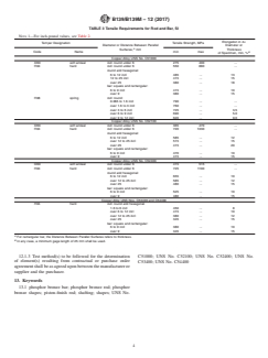 ABSTRACT This specification establishes the requirements for rods, bars, and shapes of phosphor bronze with Copper Alloy UNS Nos. C51000, C52100, C52400, C53400, and C54400. The material for manufacture shall be a cast rod, bar, or billet of such purity and soundness as to be suitable for processing by hot working, cold working, and annealing to produce a uniform wrought structure in the finished product. Tempers available under this specification are O60 (soft anneal temper), H04 (hard temper), and H08 (spring temper). Products shall be tested and shall adhere to dimensional (mass, diameter, shape, length, straightness, and edge contour), mechanical (tensile strength, and elongation), and chemical composition requirements. SCOPE 1.1 This specification establishes the requirements for phosphor bronze rod, bar, and shapes. 1.2 Units—Values stated in either inch-pound units or SI units are to be regarded separately as standard. Within the text, SI units are shown in brackets. The values stated in each system may not be exact equivalents; therefore, each system shall be used independently of the other. Combining values from the two systems may result in nonconformance with the specification. 1.3 This international standard was developed in accordance with internationally recognized principles on standardization established in the Decision on Principles for the Development of International Standards, Guides and Recommendations issued by the World Trade Organization Technical Barriers to Trade (TBT) Committee.