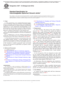 ASTM E677-94(2016) is a technical specification published by ASTM International. Its full title is "Standard Specification for Interchangeable Spherical Ground Joints". This standard covers: ABSTRACT This specification covers standard dimensional requirements for obtaining interchangeable spherical ground joints. This specification does not include physical, chemical, and design characteristics of material used. Dimensional requirements include socket member design, ball member design, size designation, dimensions, and interchangeability. Ground joints shall be tested for ball and socket dimensions and leakage. Leak rate shall be calculated based on change in differential pressure, evacuated volume and time of test. SCOPE 1.1 This specification covers standard dimensional requirements for obtaining, within practical limits, interchangeability in spherical ground joints for ordinary laboratory and industrial applications. It covers dimensional interchangeability of the ground surfaces only and does not involve design characteristics of the item except where specified, nor does it involve physical or chemical characteristics of the material used. Note 1: The dimensions pertaining to spherical ground joints were taken from the Commercial Standard CS 21–58 of the U.S. Department of Commerce. Note 2: Although glass is the most commonly used material for ground joints, other materials may be used as specified. Spherical joints constructed from glass shall conform to Specifications E438 and E671. 1.2 The following precautionary caveat pertains only to the Test Method portion, Section 4, of this specification. This standard does not purport to address all of the safety concerns, if any, associated with its use. It is the responsibility of the user of this standard to establish appropriate safety and health practices and determine the applicability of regulatory limitations prior to use.